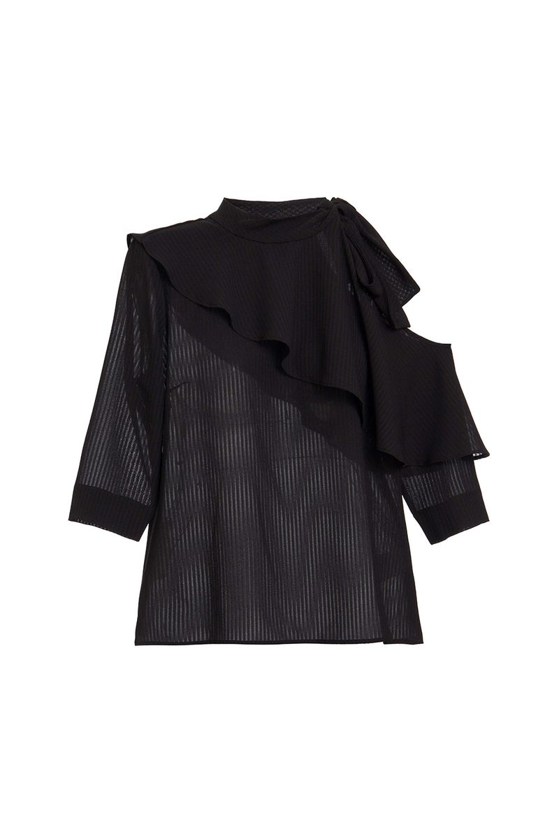 Blusa manga longa com babado, ombro vazado, faixa embutida na gola para amarração.