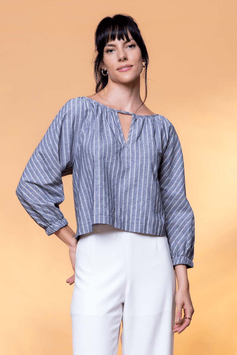 BLUSA BATA DECOTE V é a peça ideal para looks mais românticos, ótima para usar com calças de alfaiataria e jeans, tudo vai depender da combinação escolhida. Com mangas volumosas e elástico nos punhos, comprimento padrão e um leve mullet na modelagem, costas fechada e decote com recorte em V. A Peça faz parte da nossa LINHA PUSCO SER, onde todas os tecidos possuem certificação de sustentabilidade.