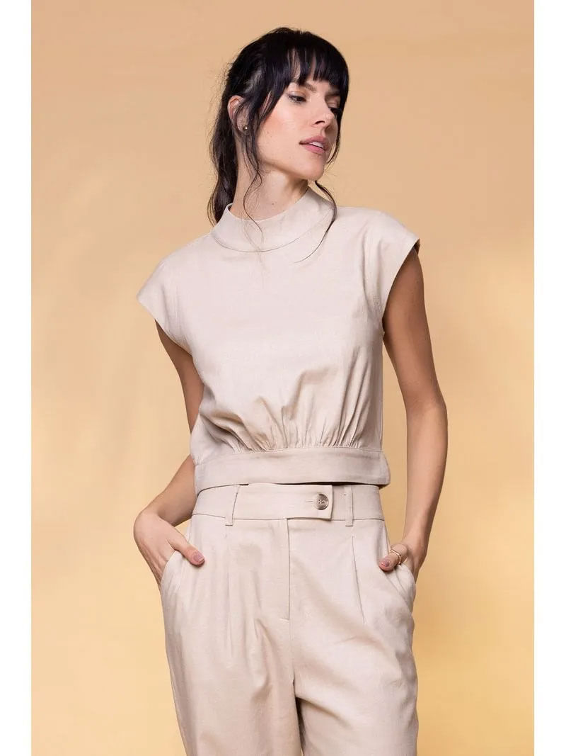 BLUSA COM PUNHO EM ELÁSTICO é moderna e muito charmosa, ótimo para combinar com peças de alfaiataria, jeans e sarja. Possui uma manga curta diferenciada, gola alta, costas fechada, punho na barra na parte da frente e elástico nas costas, com leve franzido e comprimento curto.