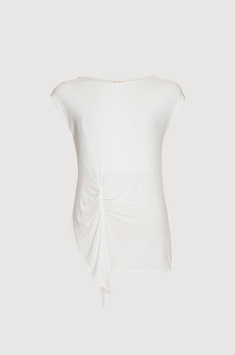BLUSA FRANZIDA tem o estilo que vai com tudo, muito versátil é uma ótima escolha para looks de trabalho e happy hour. Com gola canoa, leve manga sem costura, barra mullet e detalhe de franzido na frente. - Comprimento padrão - Modelagem Mullet - Franzido frontal - Costas fechada - Manga curta - Decote canoa Composição: 73% Viscose 17% Elastano