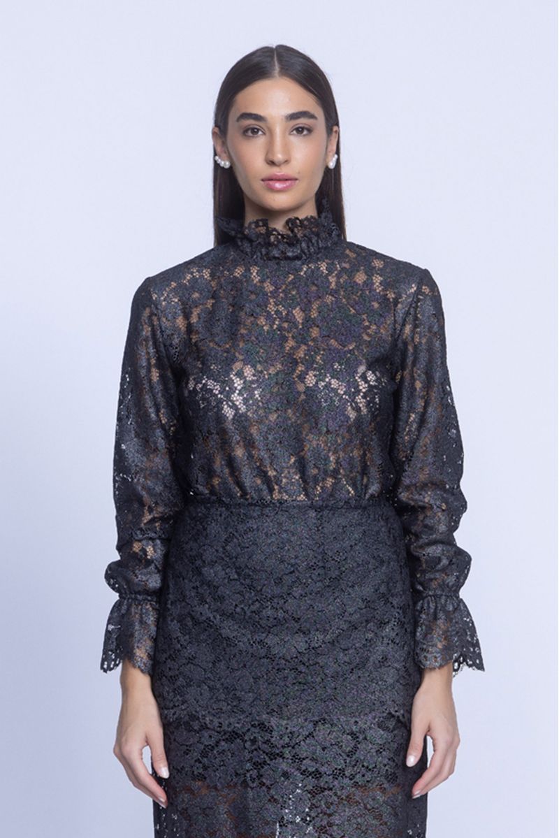 A BLUSA RENDA FOIL ML é uma peça incrível, produzida em renda com foil a peça tem efeito transparente, goal alta e punhos formando babados dando um toque glamuroso e moderno para sua produção. Use com a SAIA RENDA FOIL COM SOBRESAIA da mesma família para um look ainda mais pefeito.