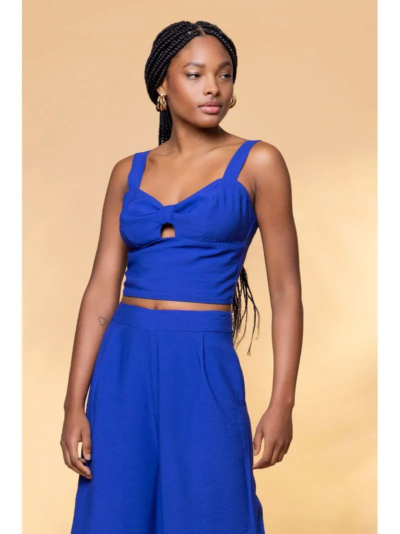 BLUSA TOP NÓ E ABERTURA será sua alfaiataria preferida nos dias quentes, super charmosa e versátil, combine com as pessoas da mesma família o SHORTS COM PENCE E PALA CÓS ou CALÇA PANTALONA CROPPED COM FENDA e para finalizar a produção o COLETE COM FAIXA ALFAIATARIA deixando tudo ainda mais fashion. Com alça de espessura média, comprimento curto, nó no busto com uma leve abertura e costas com elástico.