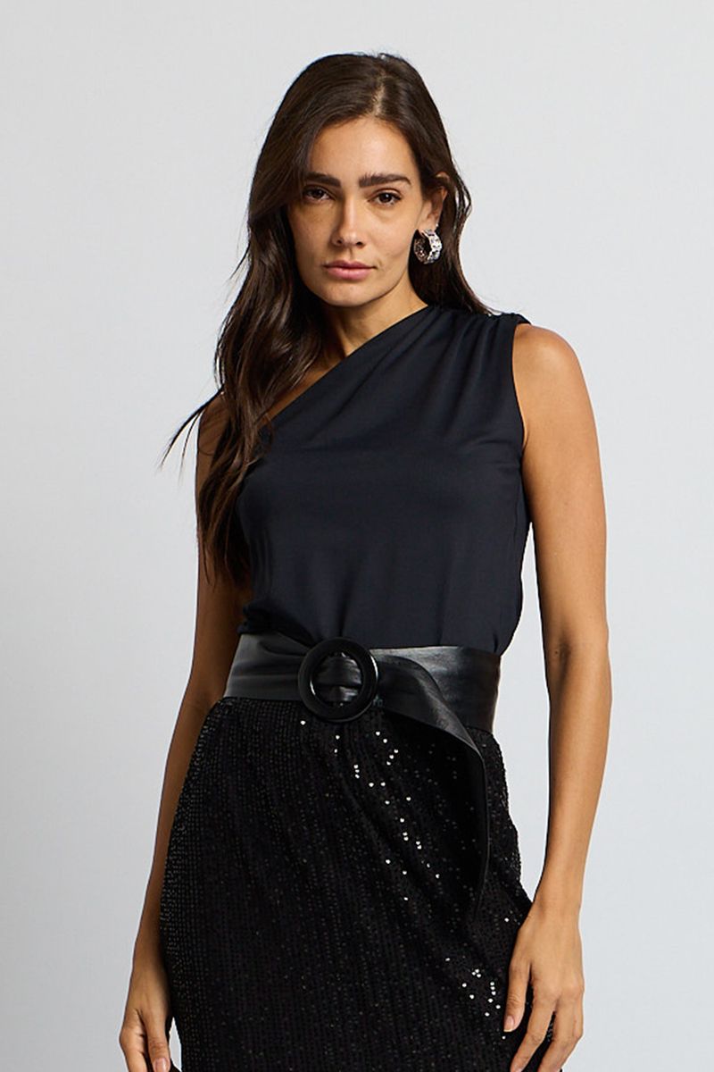 Com design assimétrico e toque moderno, esta blusa básica de malha se destaca pelo decote de um ombro só com detalhe franzido, combinando conforto e estilo em uma peça versátil para compor produções casuais ou sofisticadas.