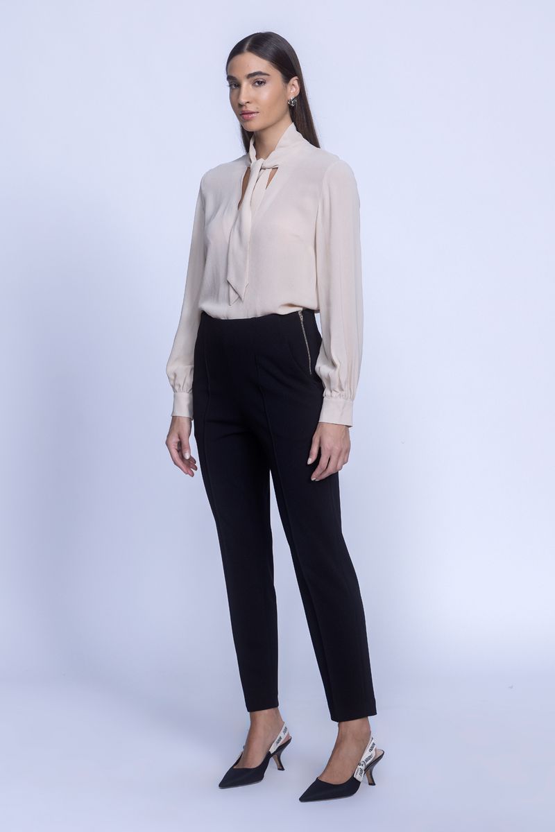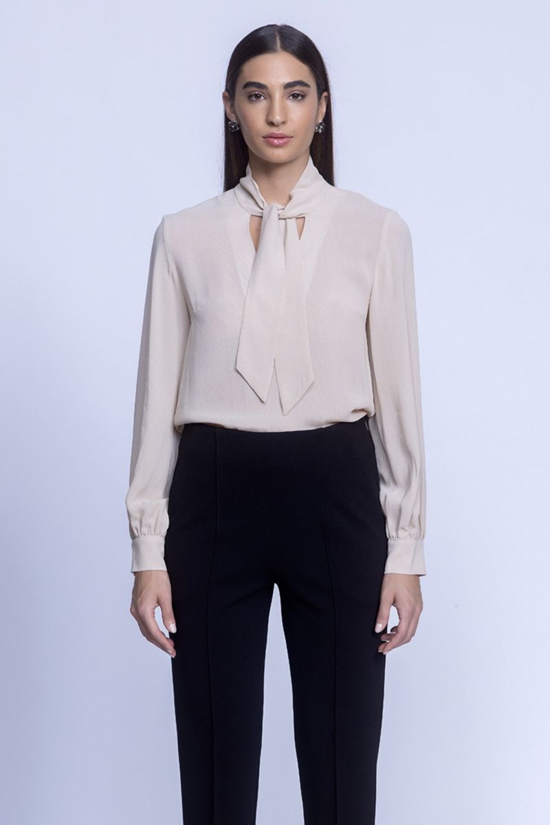 BLUSA VISCOSE COM DETALHE GRAVATA é charmosa e ideal para aquele look de trabalho, use com peças de alfaiataria para um look mais formal e com peças jeans e de malha para uma produção mais casual, tudo vai depender da proposta. A peça de georgette com viscose na composição tem toque leve e caimento fluido, possuindo na gola uma faixa fixa para amarração, deixando seu look ainda mais chique.