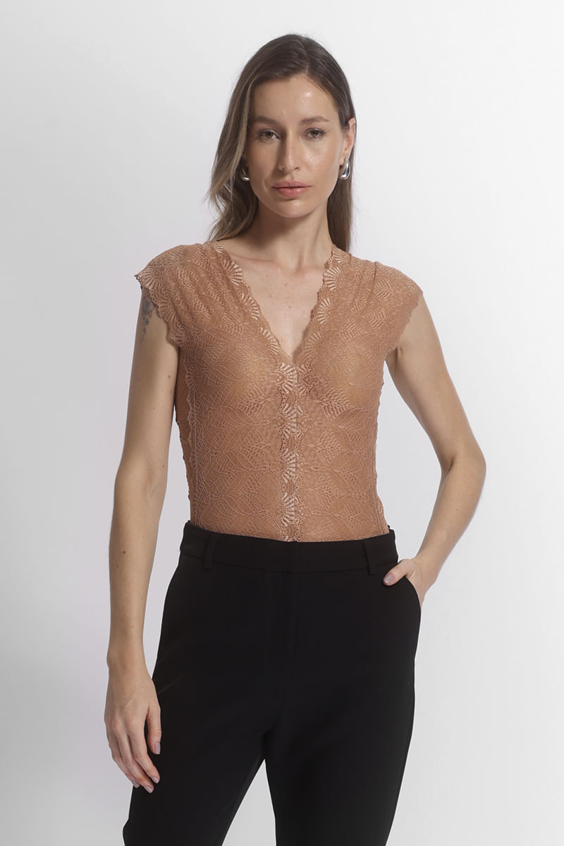 BODY RENDA DECOTE V SEM MANGAS é a perfeita fusão entre sensualidade e elegância. O decote V valoriza o colo de forma sofisticada, enquanto a renda, com seu delicado e intricado desenho, confere um toque de romantismo e leveza. Sem mangas, a peça proporciona um visual clean e moderno, ideal para compor tanto looks de noite quanto opções mais descontraídas. Versátil e cheia de estilo, esse body é perfeito para quem busca um toque de sofisticação e charme, seja como peça única ou combinado com outros itens da sua coleção de moda. -Sem mangas -Decote V -Transparente -Parte inferior tecido liso -Botões em baixo para fechamento.