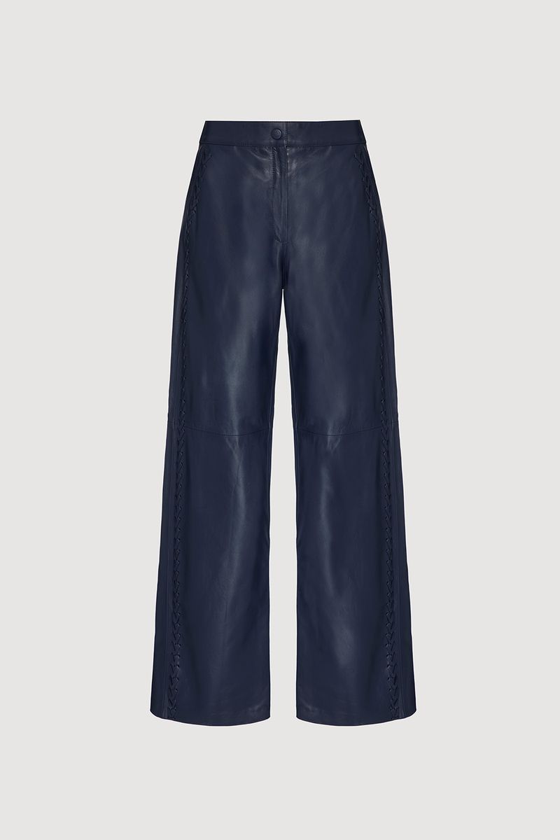 Calça Reta de Couro com Bordado Lateral