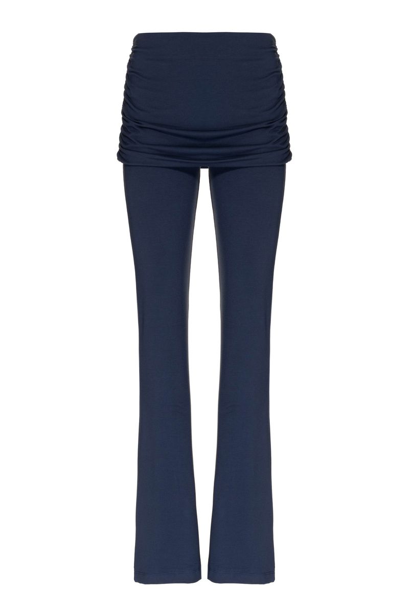 A Calça Malha Flare com Saia Franzida é uma peça muito confortável e charmosa. Seu estilo flare valoriza as canelas e pés, ficando muito linda com sandália ou botinha. E a pala larga, tipo saia franzida, na região do quadril, dá todo um plus, além de você se sentir segura e confortável nos movimentos, ela fica muito bonita com vários looks, para as mais diversas ocasiões.