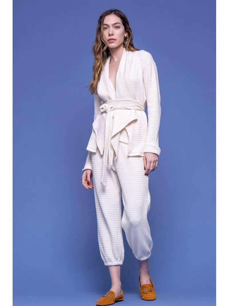 A Calça de Malha Waffle com Pala Franzida é um charme só! Estilo jogger, o detalhe da pala franzida no cós deixa a peça delicada, e o elástico na barra dá um toque especial. Fica ainda mais linda com o casaco do mesmo tecido, compondo um look chique e sofisticado.