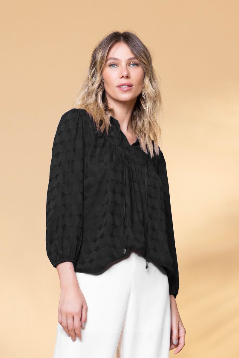 CAMISA VISCOSE BATA JACQUARD é uma ótima escolha para looks de verão, super versátil combina com diversas roupas do seu guarda roupa. Possui manga longa com elástico no punho, decote fechado com amarração, costas fechada, silhueta soltinha e comprimento padrão. A Peça faz parte da nossa LINHA PUSCO SER, onde todos os tecidos possuem certificação de sustentabilidade.
