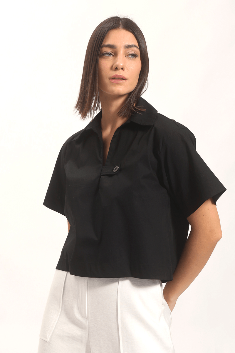 CAMISA CROPPED é charmosa e estilosa, ótima escolha para diversas ocasiões. Combine com calças jeans, de alfaiataria e saias de malha e tricot, finalizando com aquele sapato super chique para aquele momento mais formal ou tênis e sandália para momentos mais informais. A camisa possui um detalhe no decote com acabamento em botão deixando a peço ainda mais moderna e diferenciada.