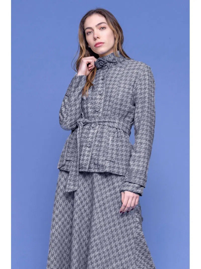 Casaco pied de poule em jeans,peça super bacana ,diferenciada e linda -estrutura solta levemente acinturada -possui uma faixa do proprio tecido -gola alta -comprimento logo abaixo do quadril -composição 85% algodão e 15% poliester