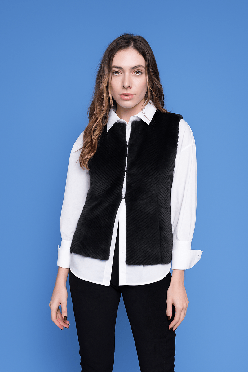 - Colete de tricot com pêlo sintético - Fechamento com colchete - Peça super moderna ideal para looks de outono, versátil para diversas ocasiões e sobreposições.