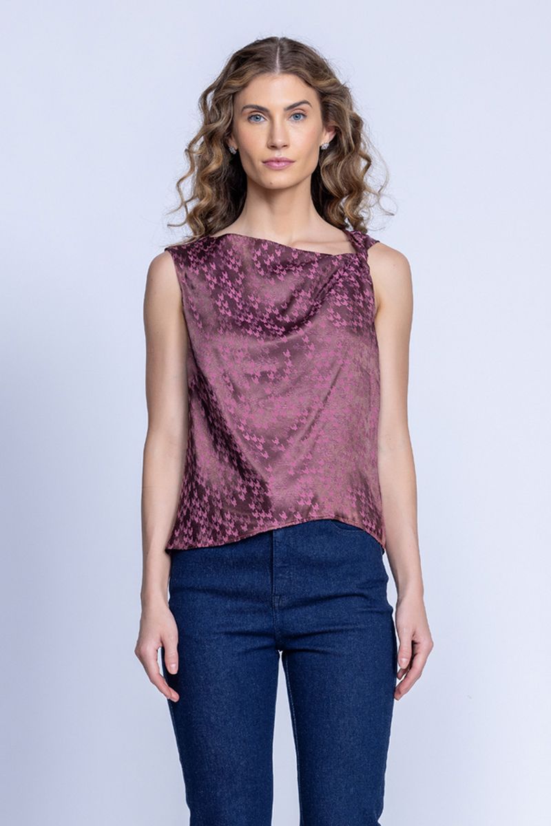 A REGATA TORCIDA CETIM JACQUARD é uma ótima peça para combinar com um jeans + um saltinho fica super chique e casual, a blusa com uma torção em uma das alças dá um charme novo e elegante a peça, com certeza uma peça super versátil para se ter e ótima para o dia a dia.