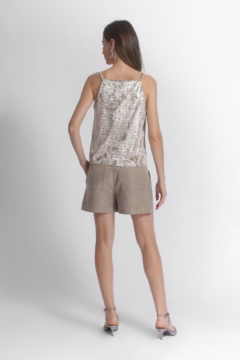 REGATA VELUDO COM DESENHO CROCO DECOTE V é a definição de sofisticação e modernidade. O veludo, com sua textura macia e luxuosa, é realçado pelo padrão croco, que traz um toque exclusivo e elegante à peça. O decote V adiciona um ar feminino e delicado, enquanto a estrutura solta oferece conforto e fluidez, criando um caimento perfeito. Ideal para quem busca uma peça versátil e sofisticada, essa regata é uma escolha certeira para compor looks sofisticados ou mais descontraídos, perfeita para combinar com uma pantalona e um salto para um look mais elegante.