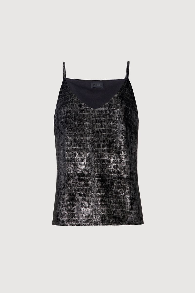 REGATA VELUDO COM DESENHO CROCO DECOTE V é a definição de sofisticação e modernidade. O veludo, com sua textura macia e luxuosa, é realçado pelo padrão croco, que traz um toque exclusivo e elegante à peça. O decote V adiciona um ar feminino e delicado, enquanto a estrutura solta oferece conforto e fluidez, criando um caimento perfeito. Ideal para quem busca uma peça versátil e sofisticada, essa regata é uma escolha certeira para compor looks sofisticados ou mais descontraídos, perfeita para combinar com uma pantalona e um salto para um look mais elegante.