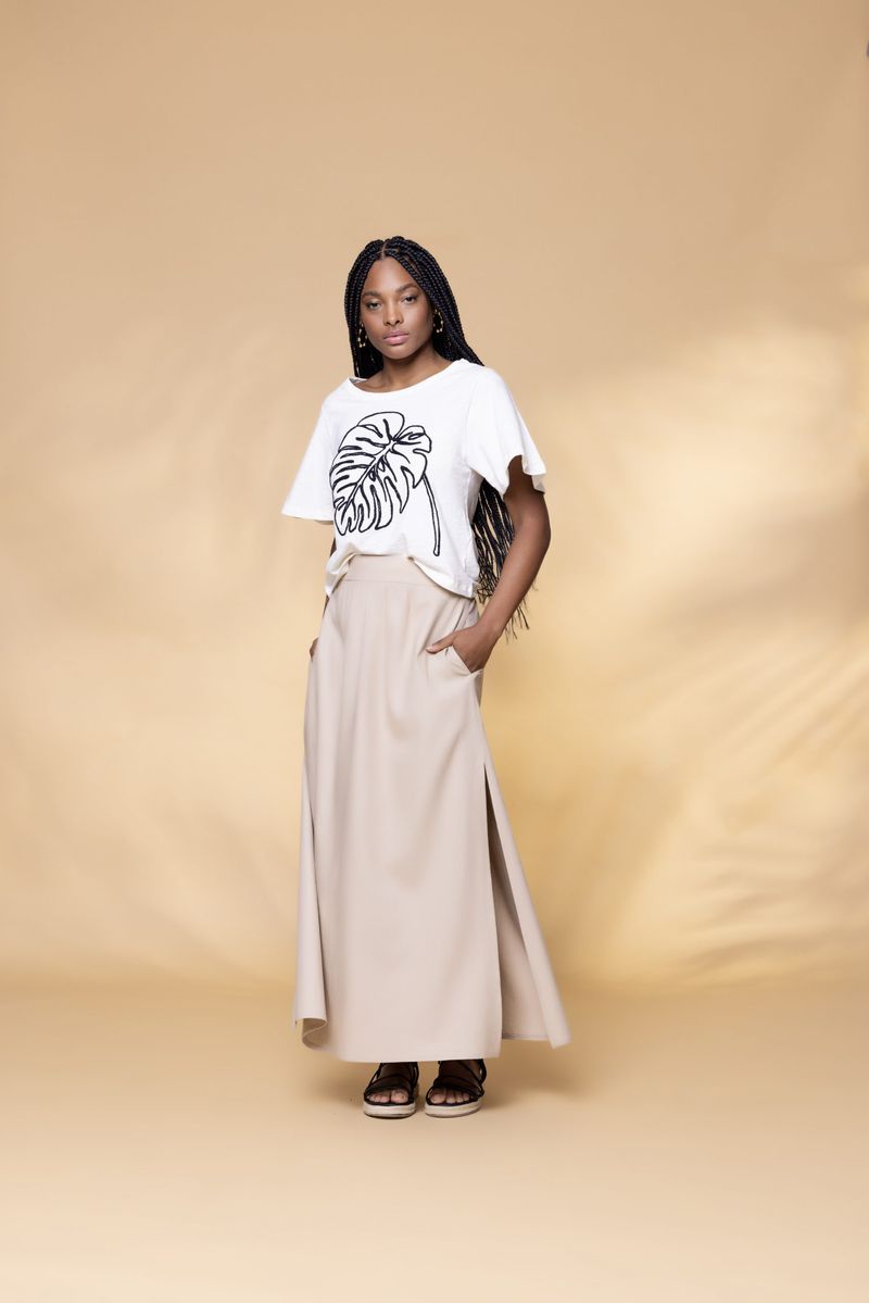 SAIA COM ELÁSTICO TRASEIRO E ABERTURA LATERAL é super moderna e ideal para aqueles dias mais quentes. Com elástico no cós na parte de trás, comprimento midi, abertura nas laterais e silhueta reta.
