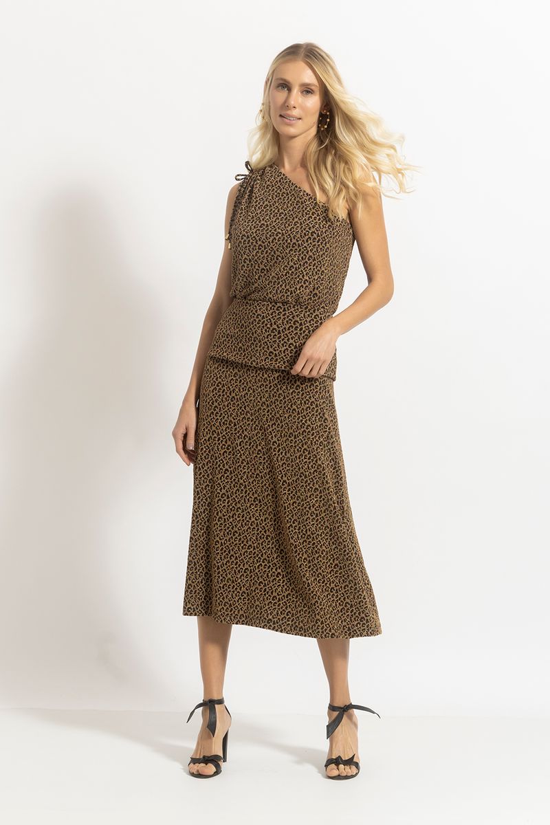 SAIA MALHA BRILHO ANIMAL PRINT é ideal para aquele look festa proporcionando um visual arrasador. A peça confeccionada em malha fluida de jacquard animal print com fios o lurex, possui uma pala sobreposta fixa dando movimento e volume ao visual. Combine com blusas básicas de malha e tricot e também com a BLUSA 1 OMBRO MALHA BRILHO ANIMAL PRINT, da mesma família, apresentando uma produção super chique e sofisticada.