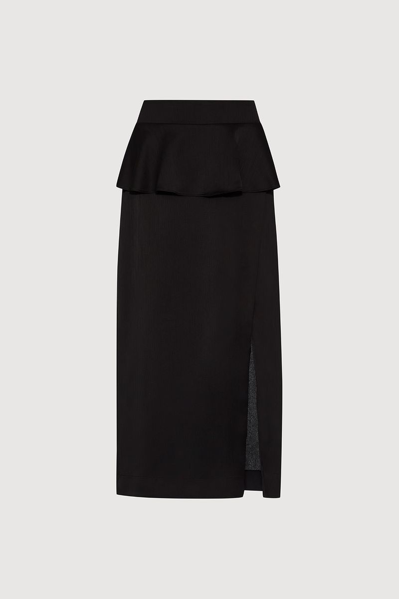 Saia Midi Acetinada com Peplum e Fenda Frontal