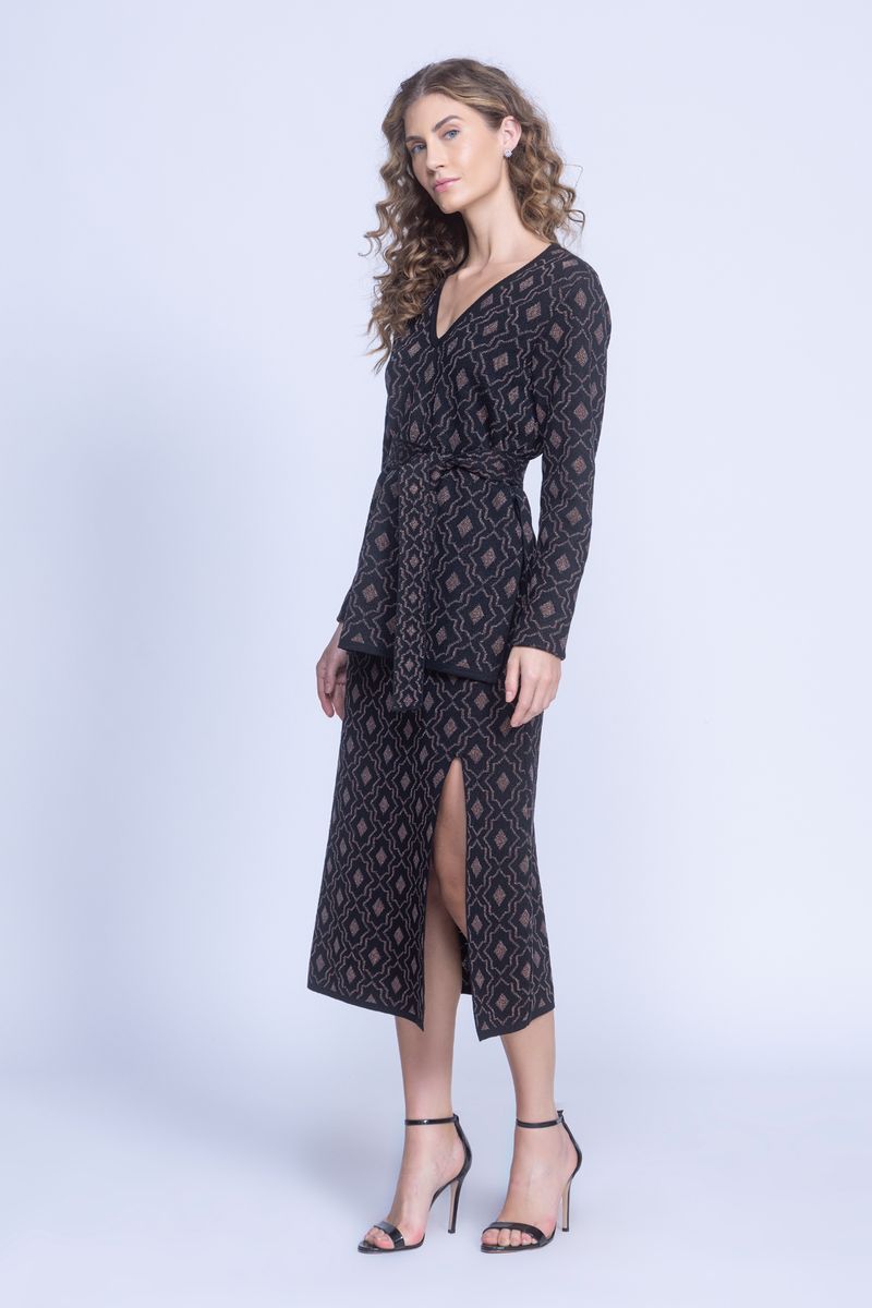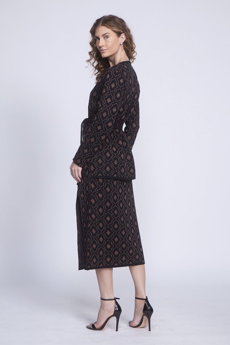 SAIA TRICOT MIDI JACQUARD LUREX é elegante, fina e glamurosa, feita com fio de tricot lurex e jacquard dando um visual ainda mais chique. Ótima para combinar com diversos tipos de blusas de malha, tricot e para sobreposições com a linda TUNICA TRICOT JACQUARD LUREX da mesma família, uma ótima peça para esses inverno.