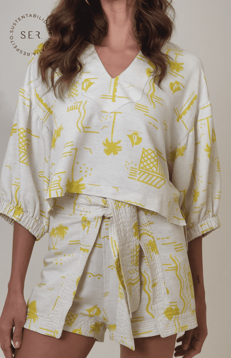 Short-saia estampa exclusiva Pusco, com velcro atrás para deixar o cós mais alto ou mais baixo, e amarração na frente para finalizar. Para montar um look super descolado