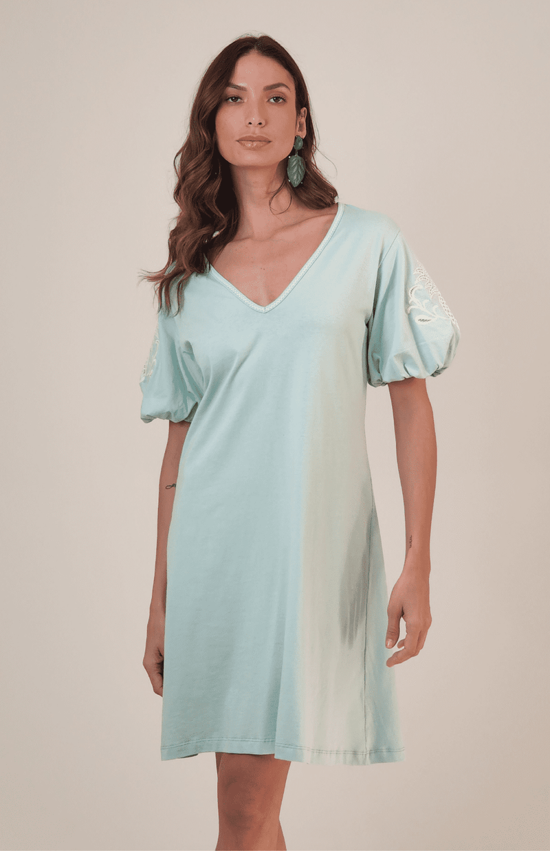 Vestido 1/2 malha bordado richelieu nas mangas ,peça linda e fresh para arrasar no verão -estrutura levemente A -manga bufante com bordado -comprimento curto ,acima do joelho.