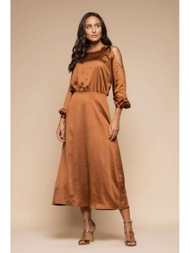O Vestido Cetim com Abertura no Ombro é super chique e refinado. A manga longa com abertura que deixa os ombros à mostra dá um toque especial, que mistura modernidade ao look clássico. A parte de cima do vestido vem com decote careca e fica tipo um bluse e a saia é cortada no evasê, num comprimento midi.