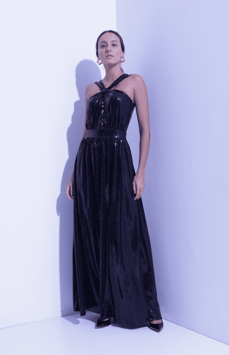 VESTIDO LONGO PAETE PRETO FRENTE ÚNICA - PRETO