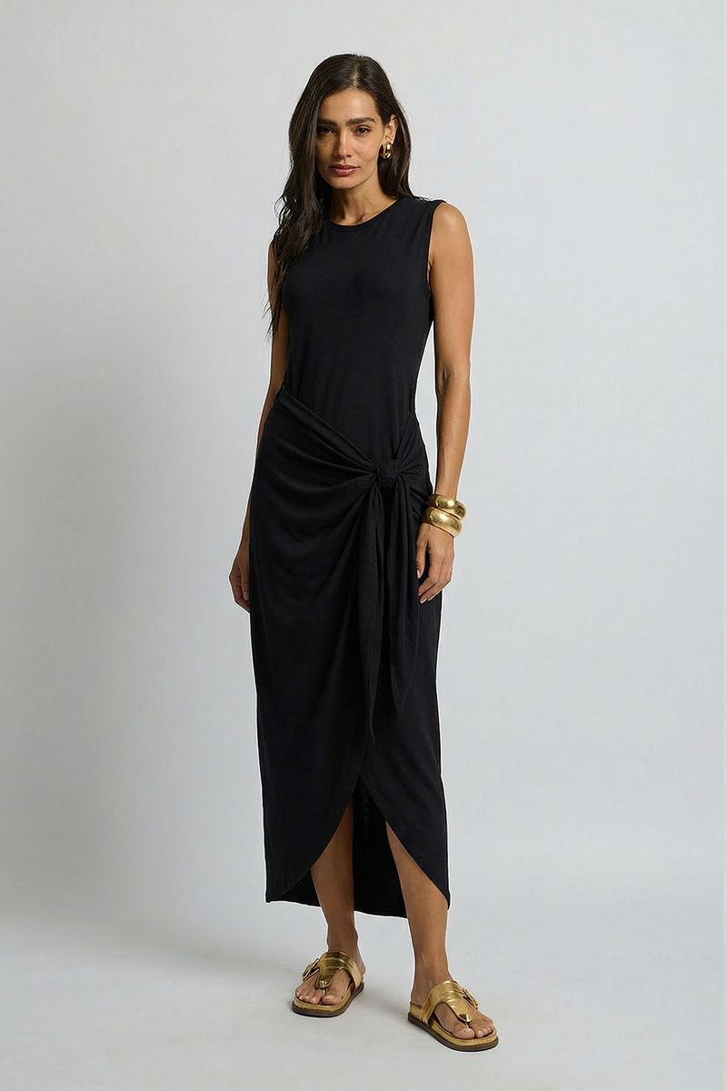 Decote redondo e sem mangas: equilíbrio entre elegância e frescor.