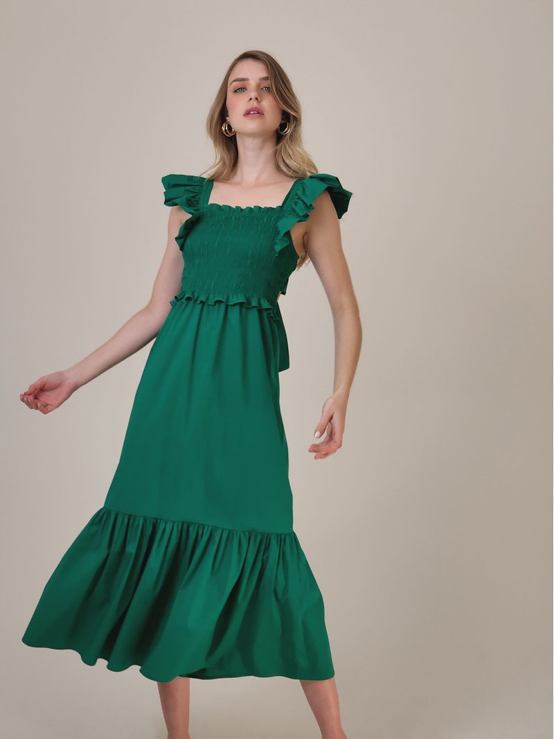 Vestido de tricoline com babados, corpo lastex, com amarração nas costas. Uma peça linda e super estilosa - Estrutura lastex corpo e saia solta - Babado na alça - Comprimento midi - Composição 76% Algodão, 20% Poliamida e 4% Elastano