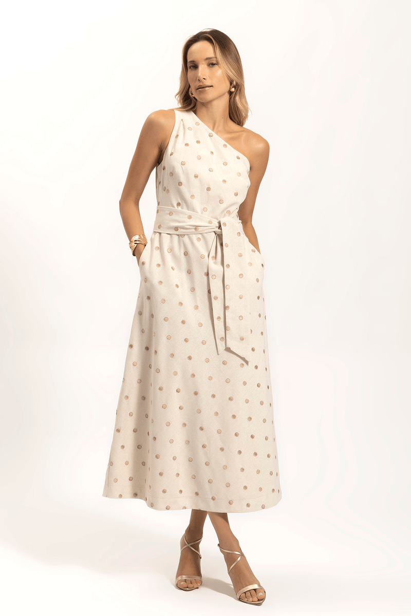 VESTIDO UM OMBRO BORDADO POÁ tem tudo para ser seu look favorito dessa temporada. Cheio de estilo, a peça é super romântica, com bordados de poá em todo tecido e com um toque de modernidade no decote assimétrico e cintura marcada. O vestido vai te acompanhar naquele passeio informal deixando o seu visual super lindo.