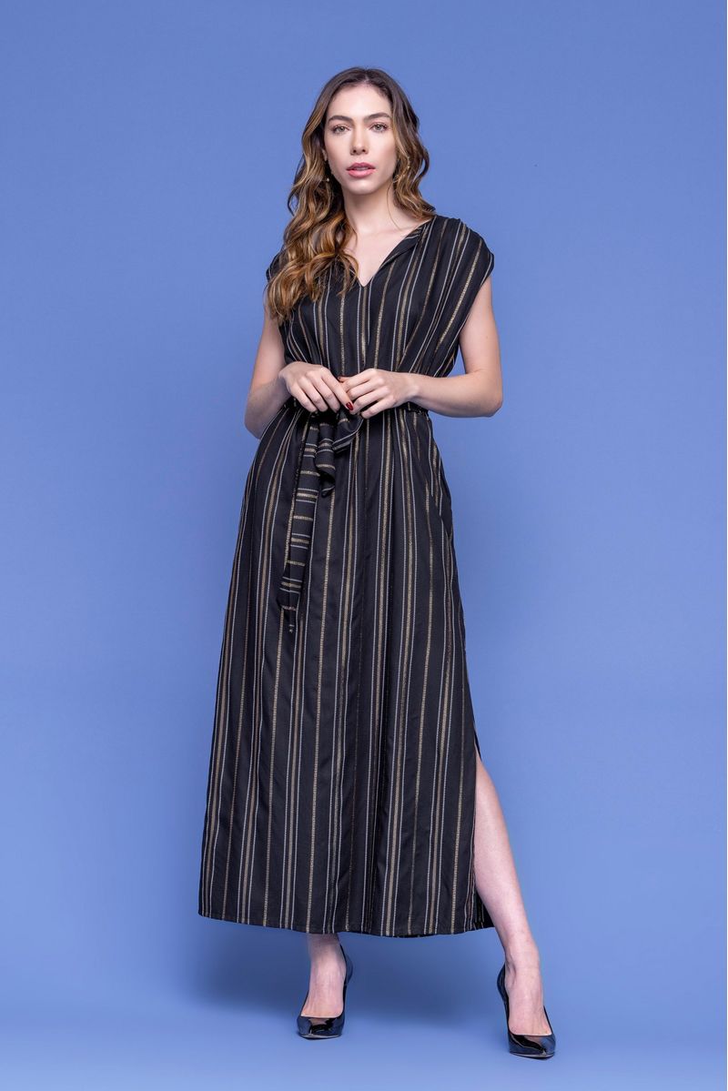 Vestido viscose com fio de lurex,amarração na cintura ,com fenda lateral super lindo !! -estrutura soltinho -sem manga -decote v -faixa do proprio tecido pode ser removivel -comprimento midi -composição 97%viscose,3%poliester