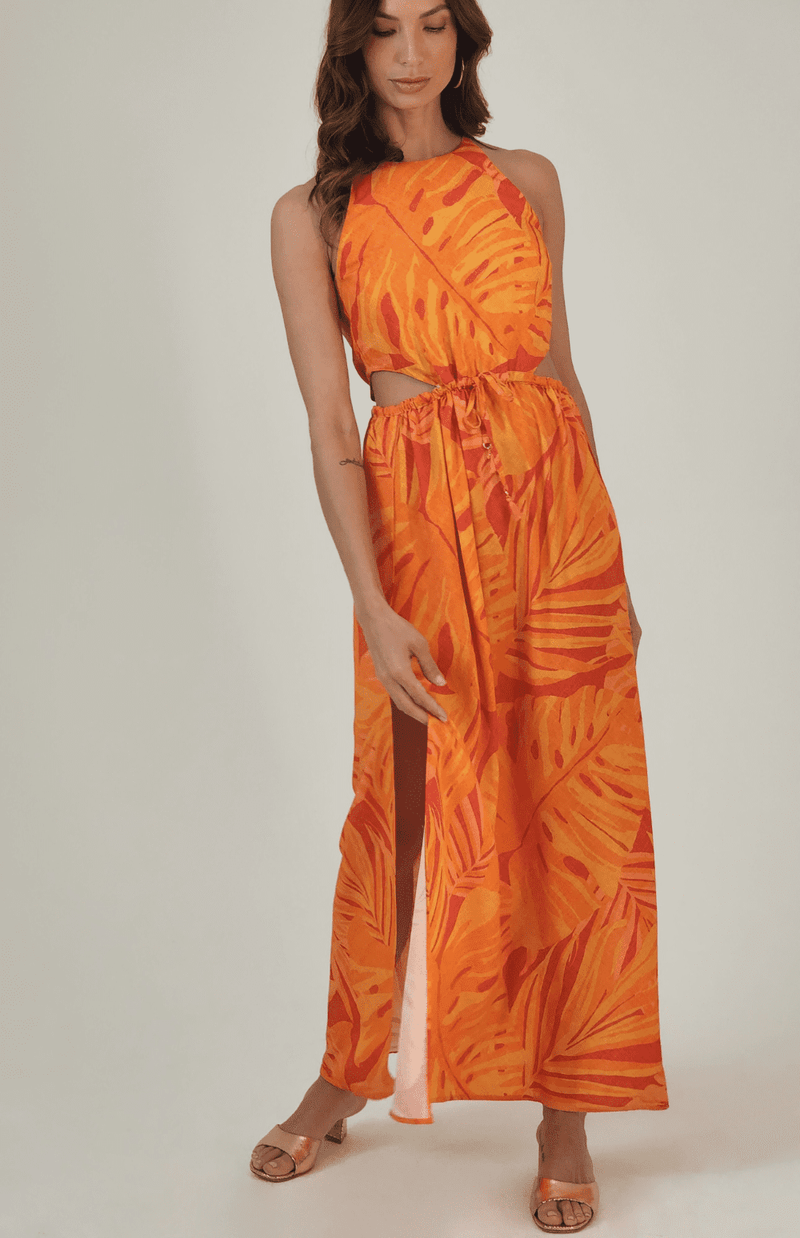 Vestido de viscose com estampa exclusiva Pusco, supermoderno e estiloso, tem abertura lateral e fenda na saia. Look super fresh e sensual